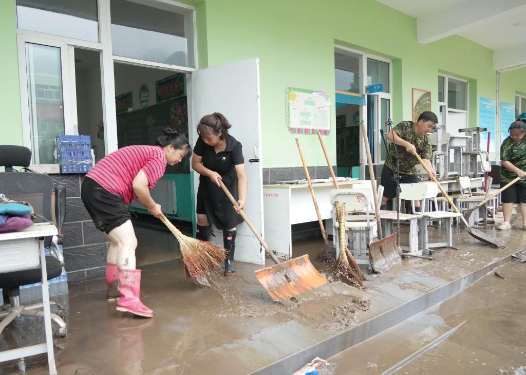 8月11日,在河北省涞水县的八一爱民学校,学校老师在清洗教室。新华社记者王昆 摄