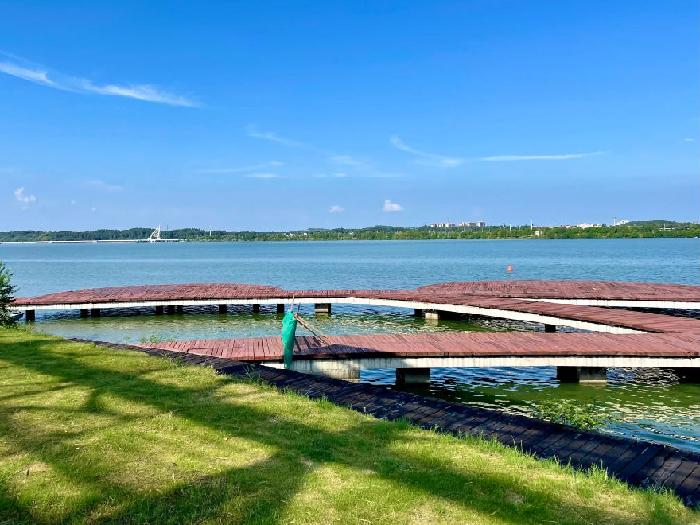 离开澧州涔槐国家湿地公园东行,记者来到位于常德市水域面积达21.8平方公里的柳叶湖。站在湖滨举目四望,只见蓝天、白云、碧水相映成趣,常德市民亲切地将其称为“柳叶蓝”。