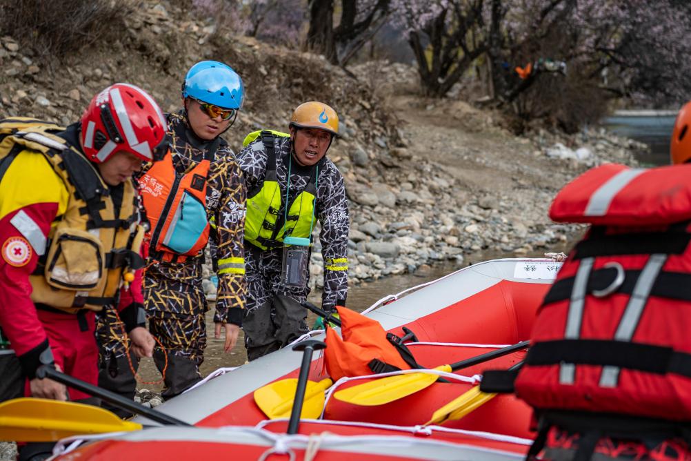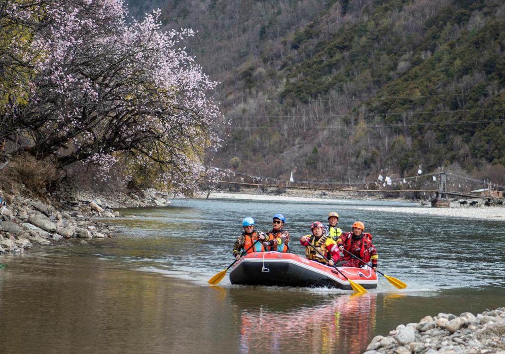 扎史品初(右二)和队友在巴河上漂流(4月13日摄)。新华社记者 孙非 摄