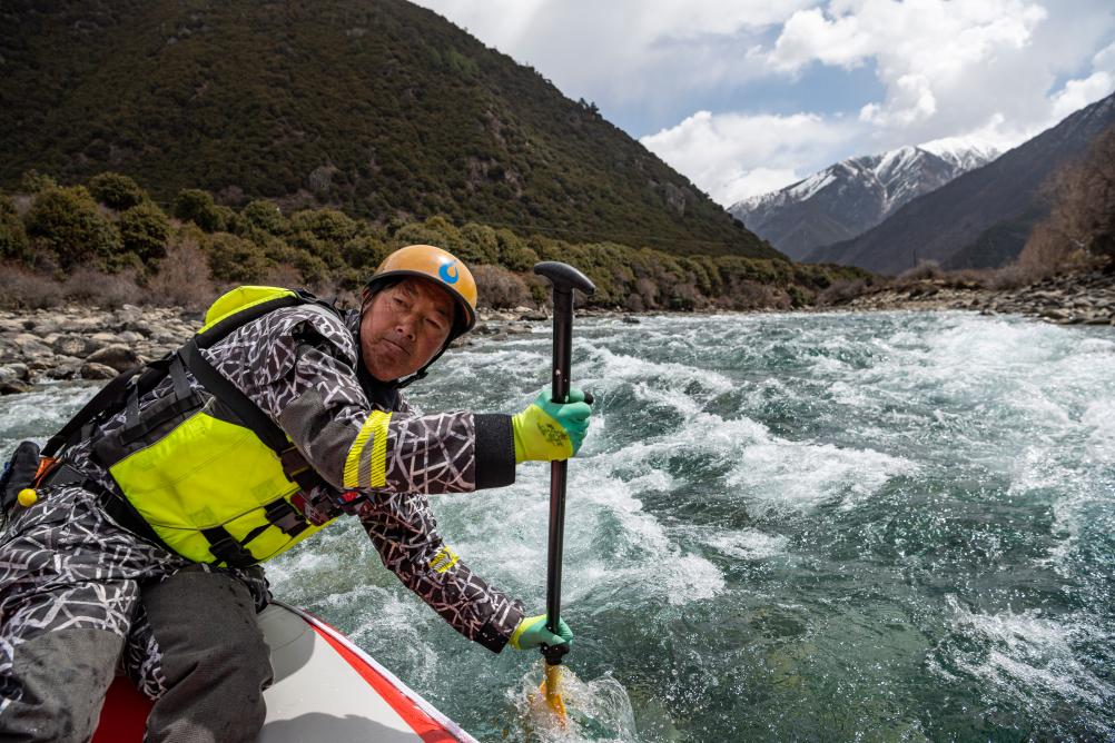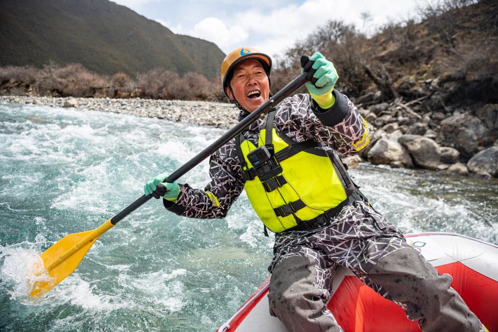 扎史品初正在巴河上漂流(4月14日摄)。新华社记者 孙非 摄