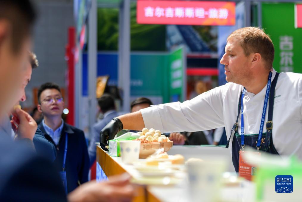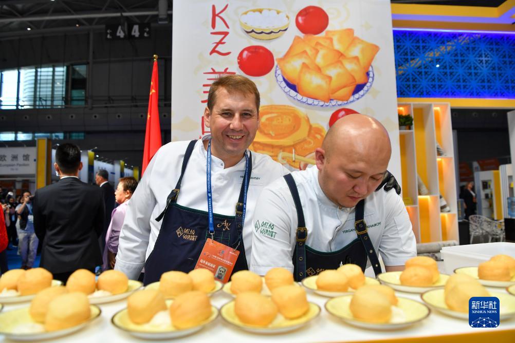 8月17日,来自哈萨克斯坦的厨师在2023(中国)亚欧商品贸易博览会上制作美食。新华社记者 赵戈 摄