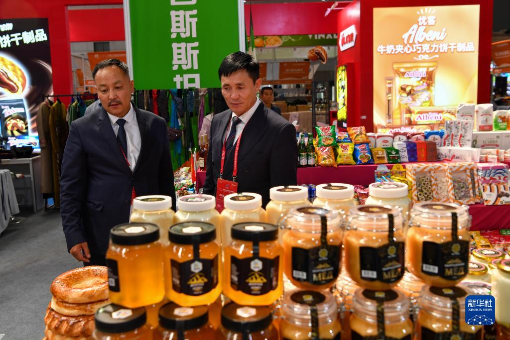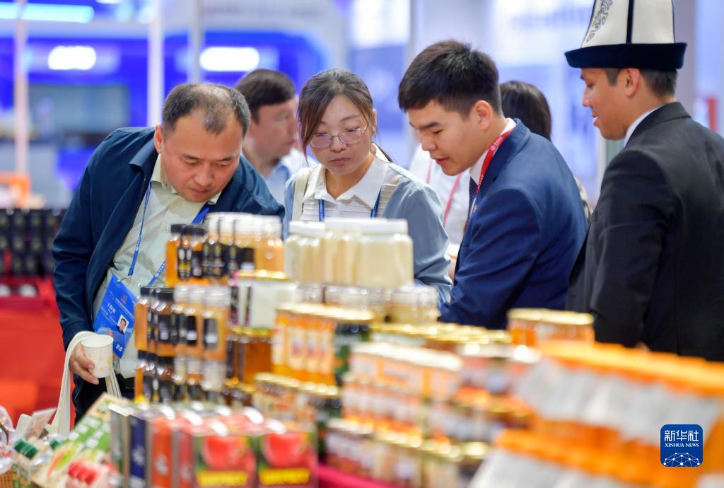 8月17日,来自吉尔吉斯斯坦的客商在2023(中国)亚欧商品贸易博览会上查看本国产的蜂蜜。新华社记者 赵戈 摄