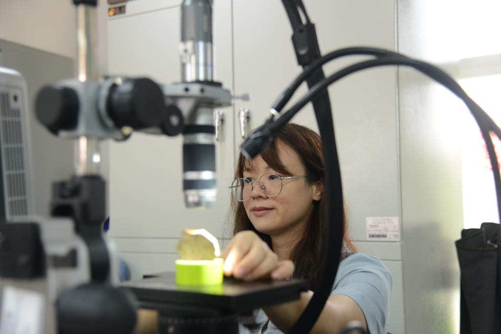 周文晖在三维视频显微镜前观察瓷器残片。新华社记者 李昊泽 摄