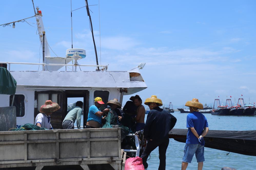 8月16日上午,温润的海风轻拂海面,一排排渔船停靠在闸坡港海湾,汽笛声阵阵起伏。休息了三个半月的渔民郑建华坐在船头,正翘首以盼正午时分开渔号角的吹响。
