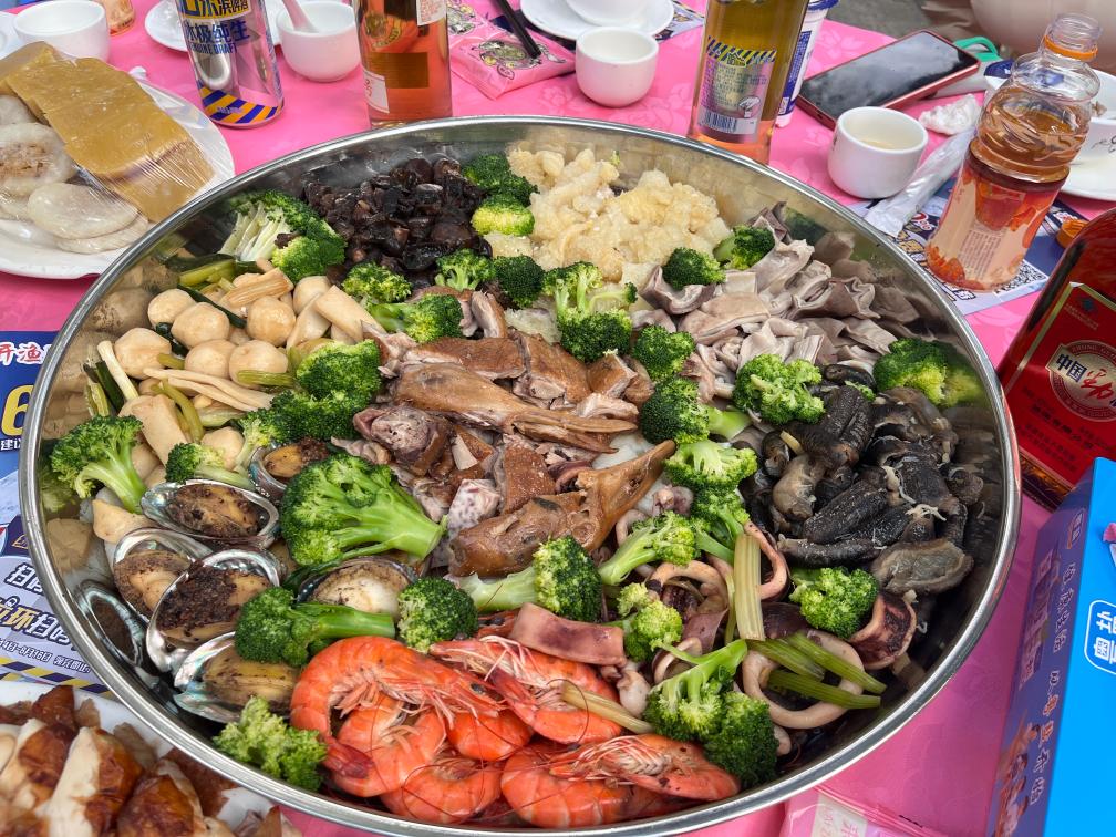 开渔宴上铺满海鲜的渔家大盘菜。(阳江广播电视台供图)