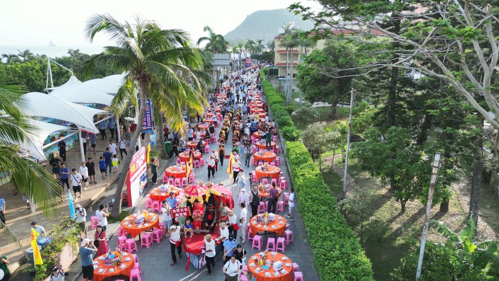上千桌宴席沿街摆开,来自五湖四海的游客和当地渔民们欢聚一堂,沐浴着星光与海风,从五柳红古鱼,到海胆海鲜饭,一道道渔家美食端上餐桌,让食客品尝舌尖美味,感受来自海陵岛的独特风味。