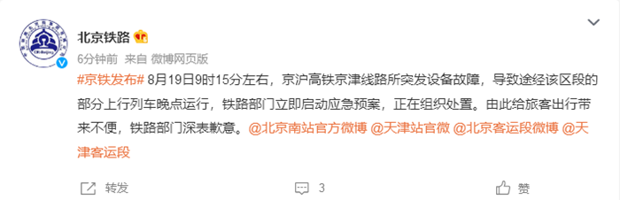 8月19日9时15分左右,京沪高铁京津线路所突发设备故障,导致途经该区段的部分上行列车晚点运行,铁路部门立即启动应急预案,正在组织处置。由此给旅客出行带来不便,铁路部门深表歉意。