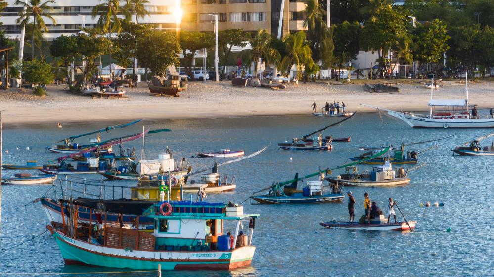 这是8月8日在巴西塞阿拉州首府福塔莱萨拍摄的渔船和渔民(无人机照片)。新华社记者王天聪摄