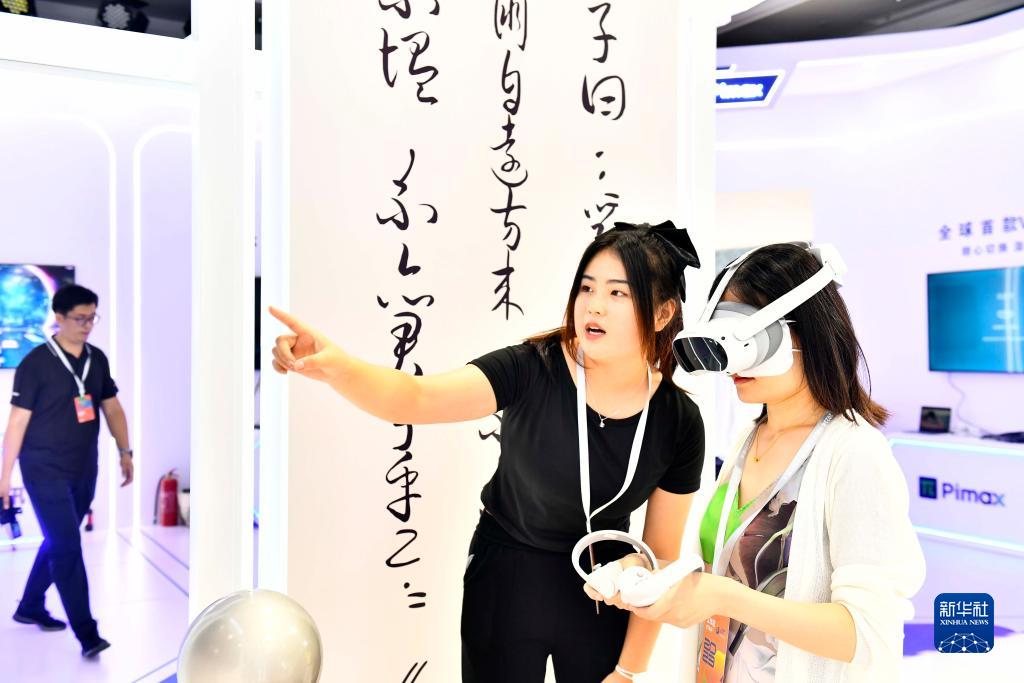 8月24日,在青岛召开的2023年中国网络视听精品创作峰会上,与会嘉宾在智能视听沉浸式体验展区体验新技术新应用。新华社记者 郭绪雷 摄