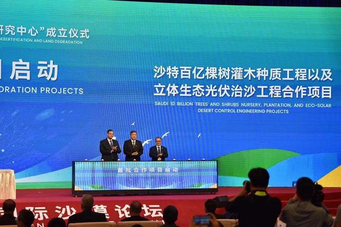 就在论坛开幕式上,国家林业和草原局与阿拉伯国家联盟秘书处签署《关于建立中阿干旱、荒漠化和土地退化国际研究中心的谅解备忘录》,揭牌中阿干旱、荒漠化和土地退化国际研究中心,并正式启动首批“沙特百亿棵树灌木种质工程和立体光伏治沙工程”合作项目。中阿双方未来将在抵御干旱影响、防治荒漠化和土地退化方面进一步深化合作,实现共赢。