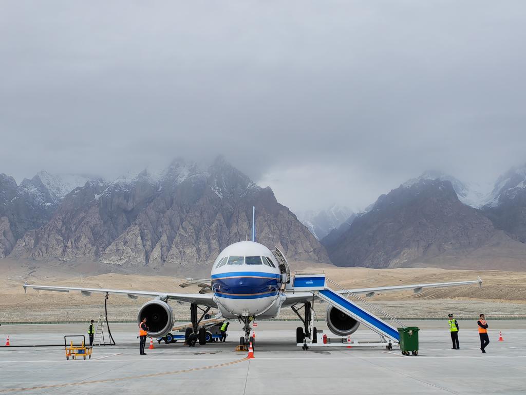 中国南方航空CZ8601次航班降落在新疆塔什库尔干红其拉甫机场(8月25日摄)。新华社记者 胡虎虎 摄