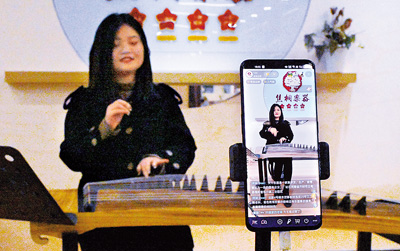 在位于河南省兰考县堌阳镇的音乐小镇里,演奏者通过直播宣传古筝。新华社记者 李安 摄