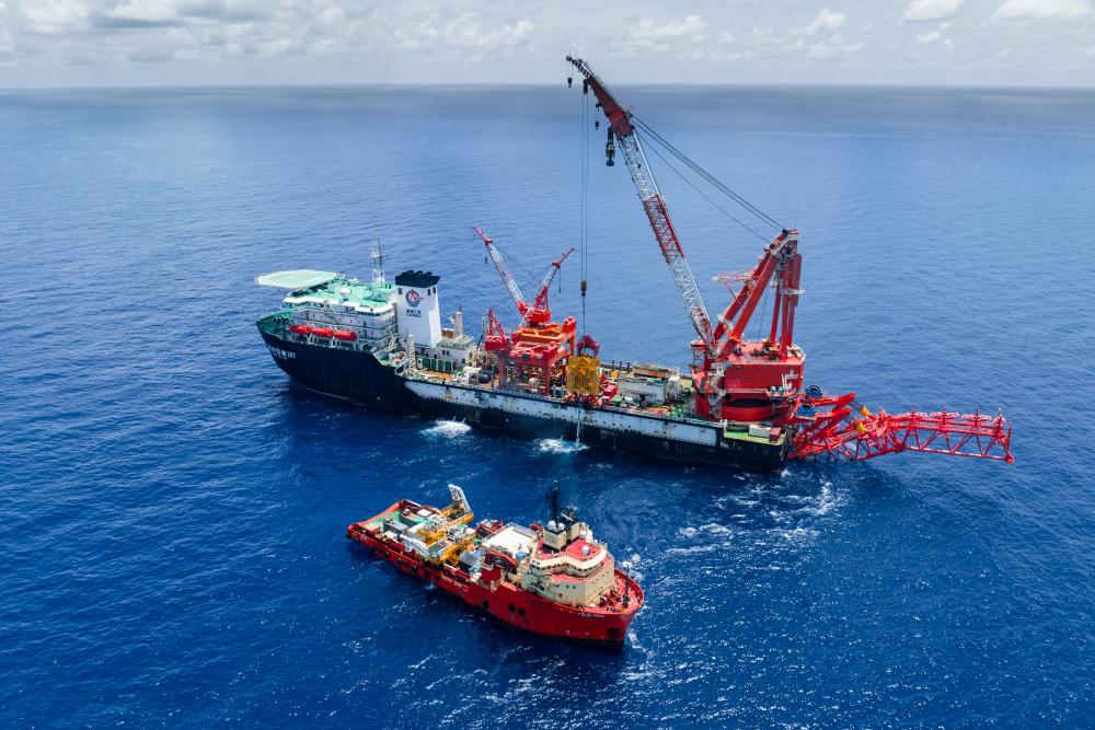 图为“深海一号”二期海底管道终端安装现场。(海洋石油工程股份有限公司供图)