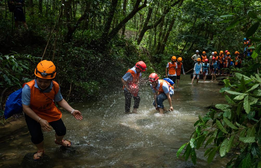 8月22日,游客在贵州省黔南布依族苗族自治州荔波县小七孔景区体验踏步戏水项目。(受访者供图)