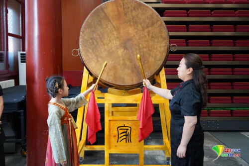 府学胡同小学举行四年级学生“入泮礼”,学生和老师共同拿起鼓槌击鼓鸣志。中国青年网记者田昕禾 摄