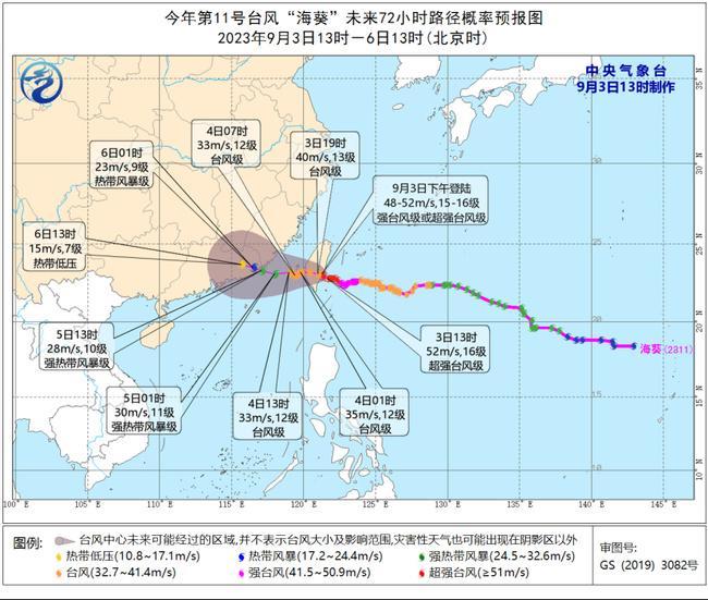 大风预报:预计9月3-6日,巴士海峡、台湾海峡、台湾以东洋面、东海南部及钓鱼岛附近海域、南海东北部偏北海域及台湾岛沿海、浙江南部沿海、福建沿海、广东东部沿海将有6~8级、阵风9~10级大风,部分海域或地区的风力有9~12级,阵风13~14级,“海葵”中心经过的附近海面或地区的风力有13~16级,阵风17级。
