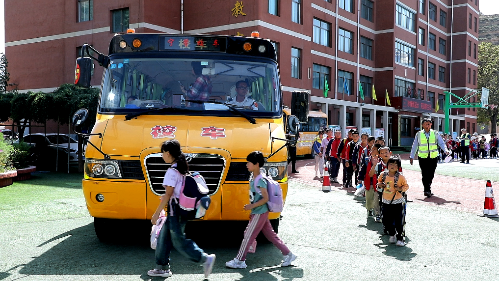 9月1日下午,孩子们在生活老师的陪伴下搭乘校车回家。新华社记者 郎兵兵 摄