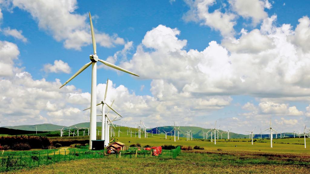 9月初,在河北坝上地区,一座座风力发电机高耸着,巨大的风叶在蓝天白云下转动。