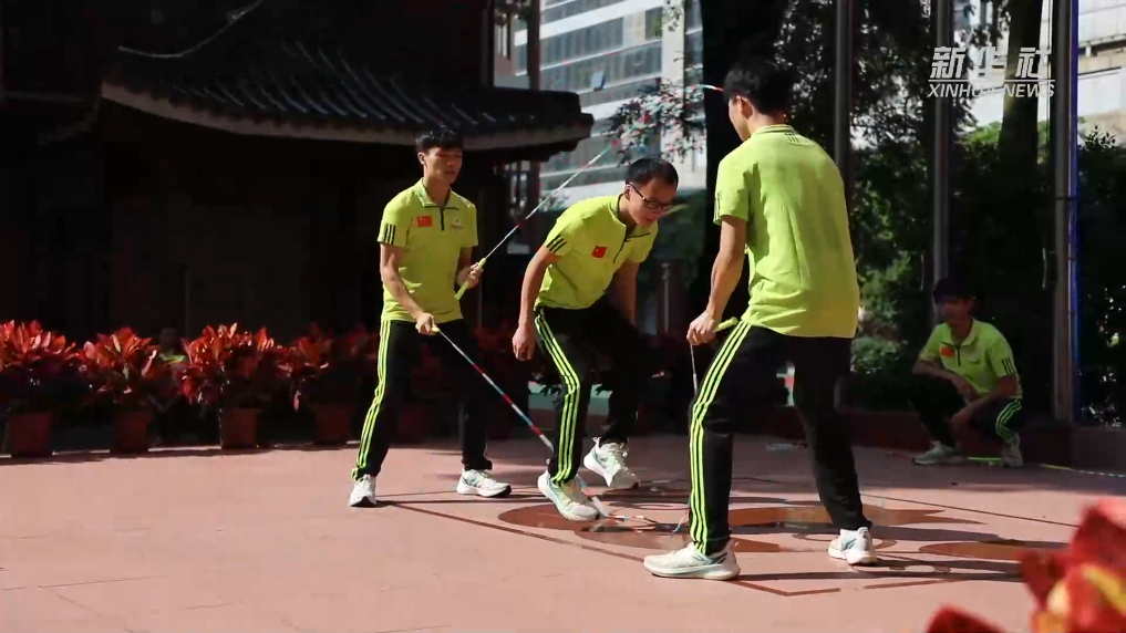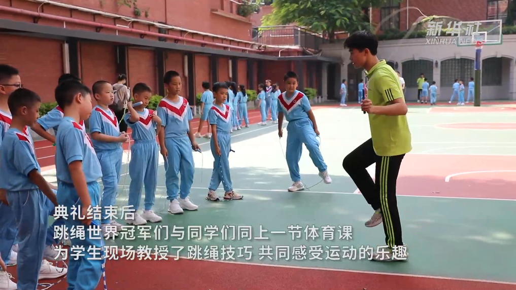 现场邀请到张崇杨、谢凯宇、陈嘉伟、岑小林四位世界跳绳冠军为大家表演花式跳绳,他们代表中国参加了2018-2023年国际跳绳比赛,并多次刷新了世界纪录。矫健而灵活的身姿,引起小学生们喝彩不断。