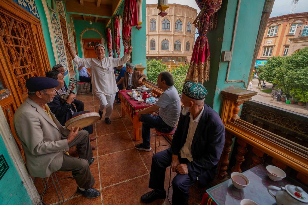 在新疆喀什古城景区内的百年老茶馆阳台上,当地居民在跳舞、聊天(2020年5月17日摄)。新华社记者 赵戈 摄