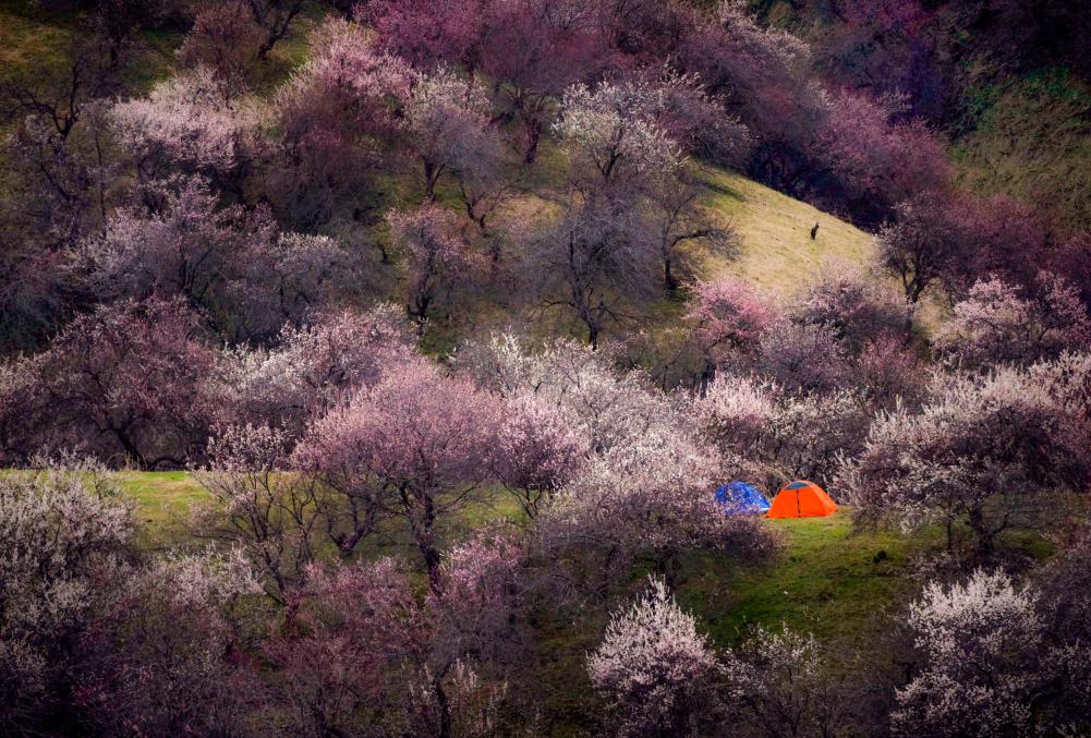 安营的帐篷让杏花沟增添了新的颜色(2017年4月16日摄)。新华社记者 赵戈 摄