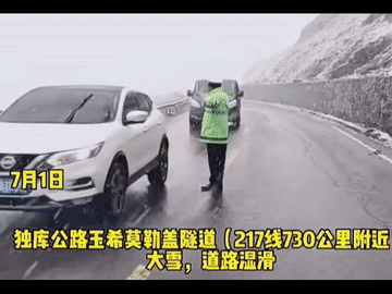 2023年7月1日,G217线独库公路部分路段出现大雪大雾天气,交警在现场引导车辆安全通行。 (新疆维吾尔自治区公安厅交通警察总队提供视频)