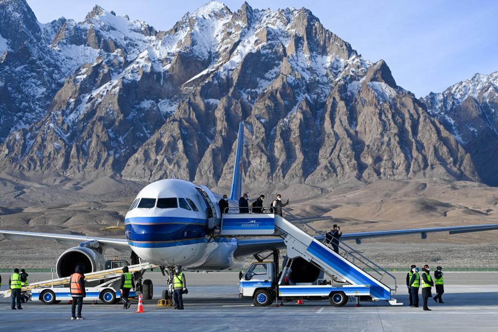 2022年12月23日,巍巍帕米尔高原上,中国最西端的运输机场——新疆塔什库尔干红其拉甫机场正式通航,冰山上迎来首批“空中来客”,这是乘坐首航航班的旅客走下飞机。新华社记者 丁磊 摄