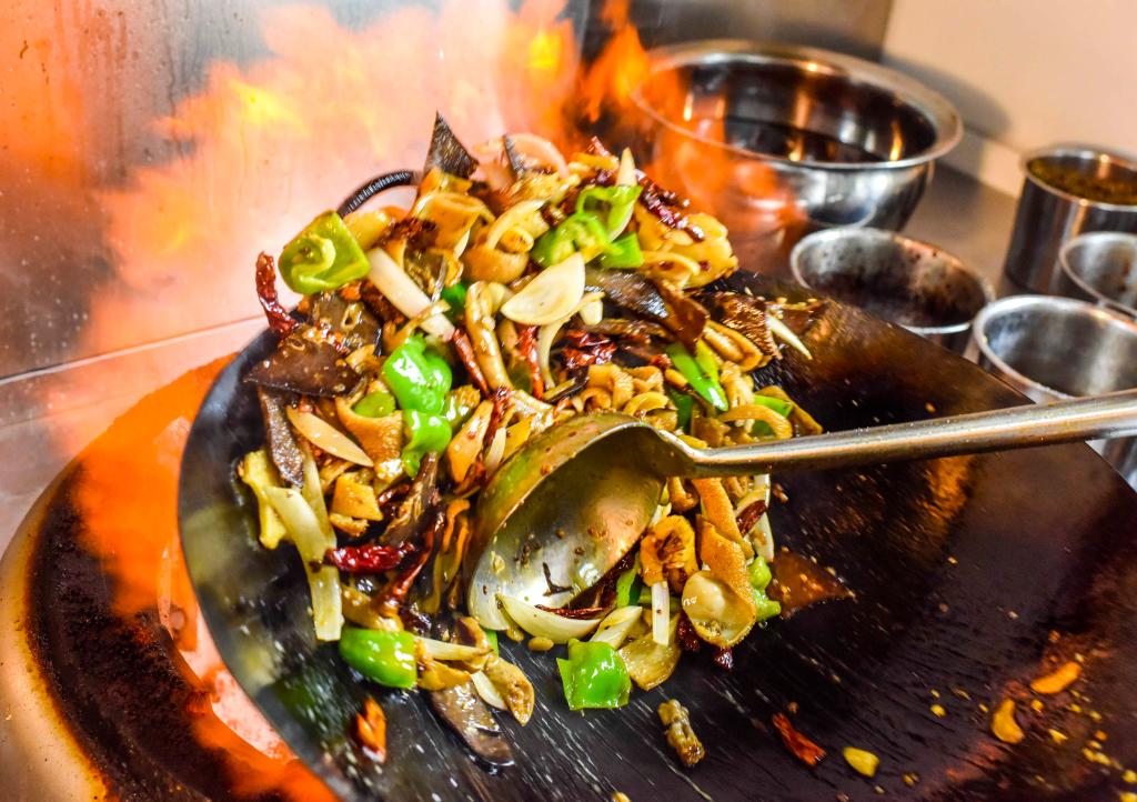 在新疆奇台县一家名叫“屯湾锅盔羊汤”的餐厅里,大厨正在制作“爆炒羊杂”(2018年7月25日摄)。新华社记者 赵戈 摄