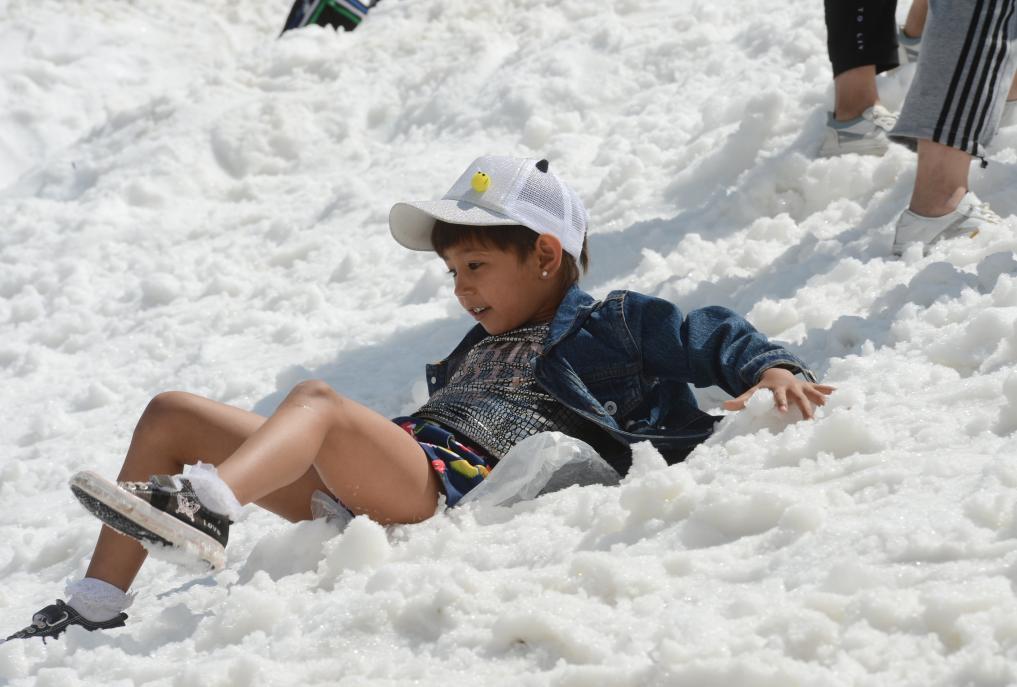 游客穿行独库公路途中,在雪山玩耍。(2021年7月9日摄)新华社记者 许晟 摄