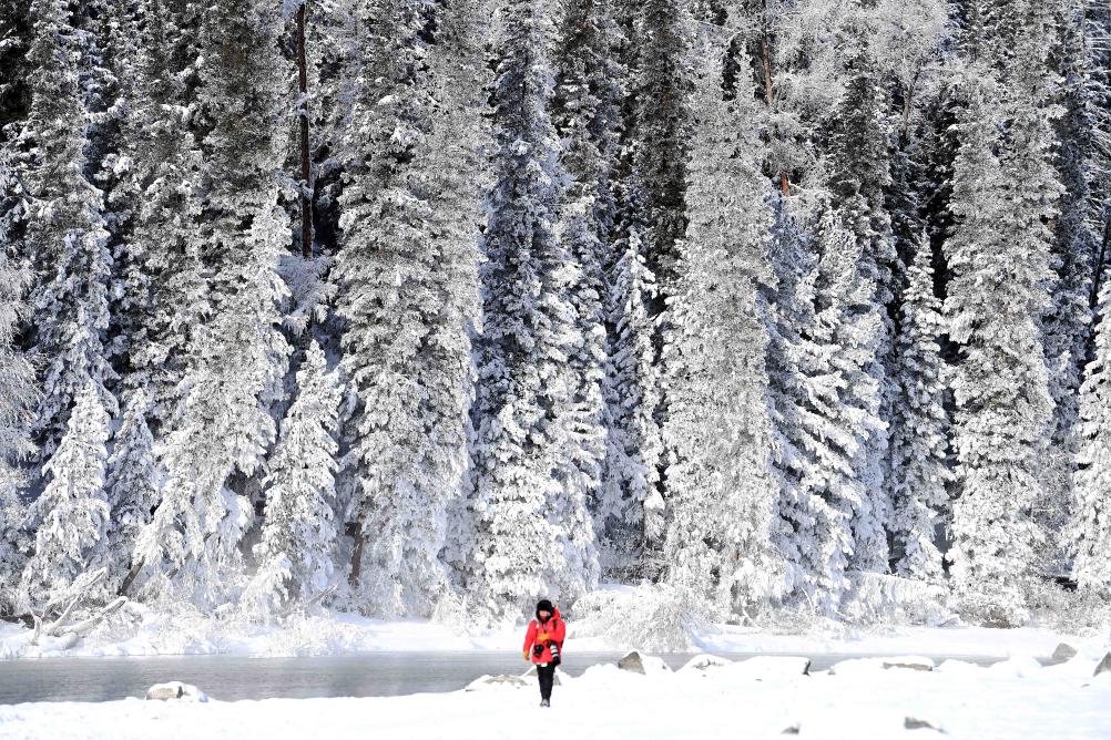 一名游客在新疆喀纳斯景区内游玩(2021年1月9日摄)。新华社记者 沙达提 摄
