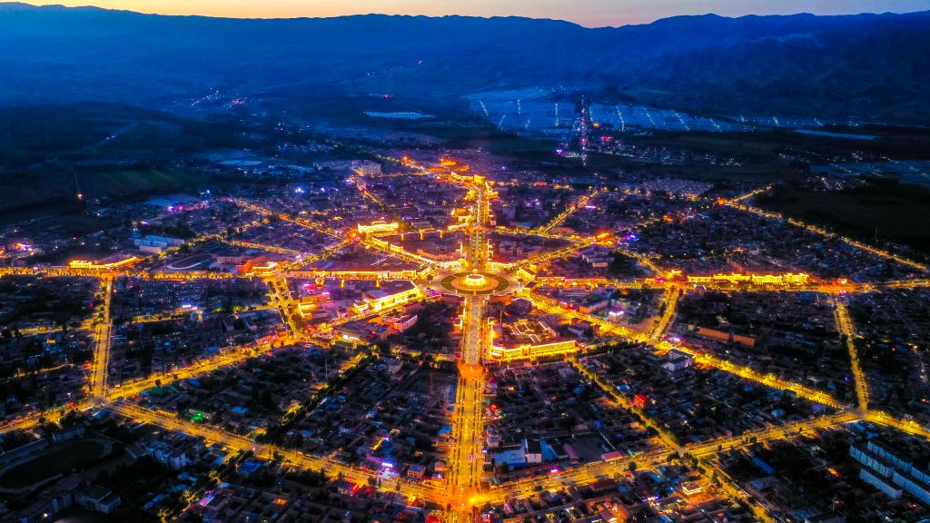 这是新疆特克斯县“八卦城”夜景(2019年8月12日无人机拍摄)。新华社记者 胡虎虎 摄
