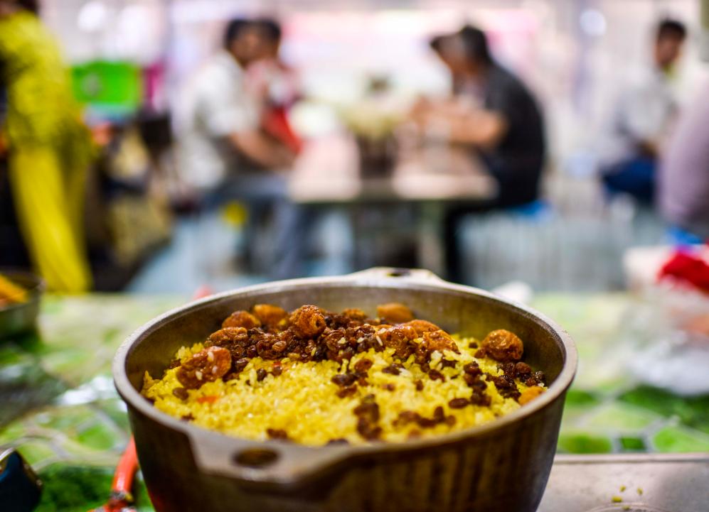 在新疆和田市的夜市里,一锅刚制作好的“小锅抓饭”吸引食客(2017年5月12日摄)。新华社记者 赵戈 摄