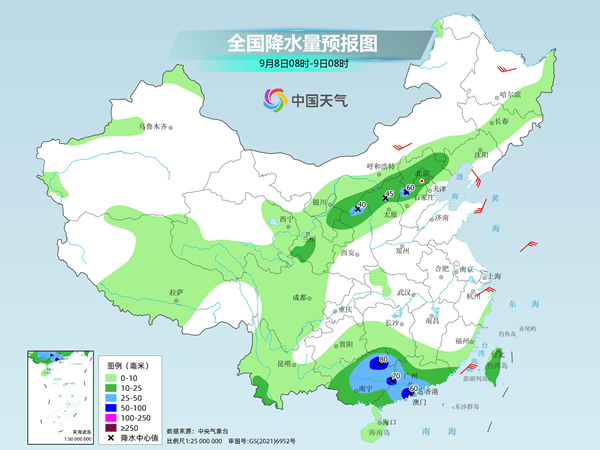 明天,甘肃南部、宁夏东部、陕西北部、山西北部、河北中北部、北京、湖南南部、广西大部、广东大部、台湾岛大部等地部分地区有中到大雨,其中,河北中部、广西东北部和东部、广东西部和南部沿海地区等地局部地区有暴雨(50~80毫米)。
