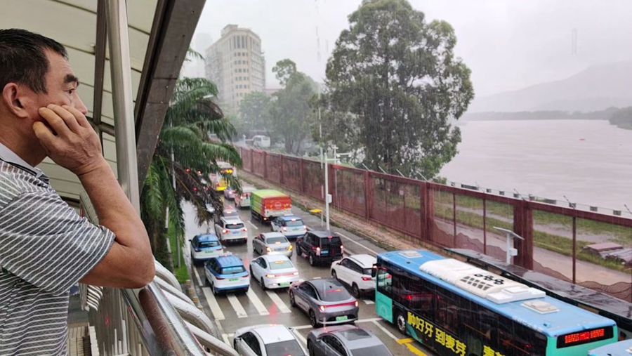 9月8日,市民在滨河大道的人行天桥上眺望涨水后的深圳河。新华社记者梁旭 摄
