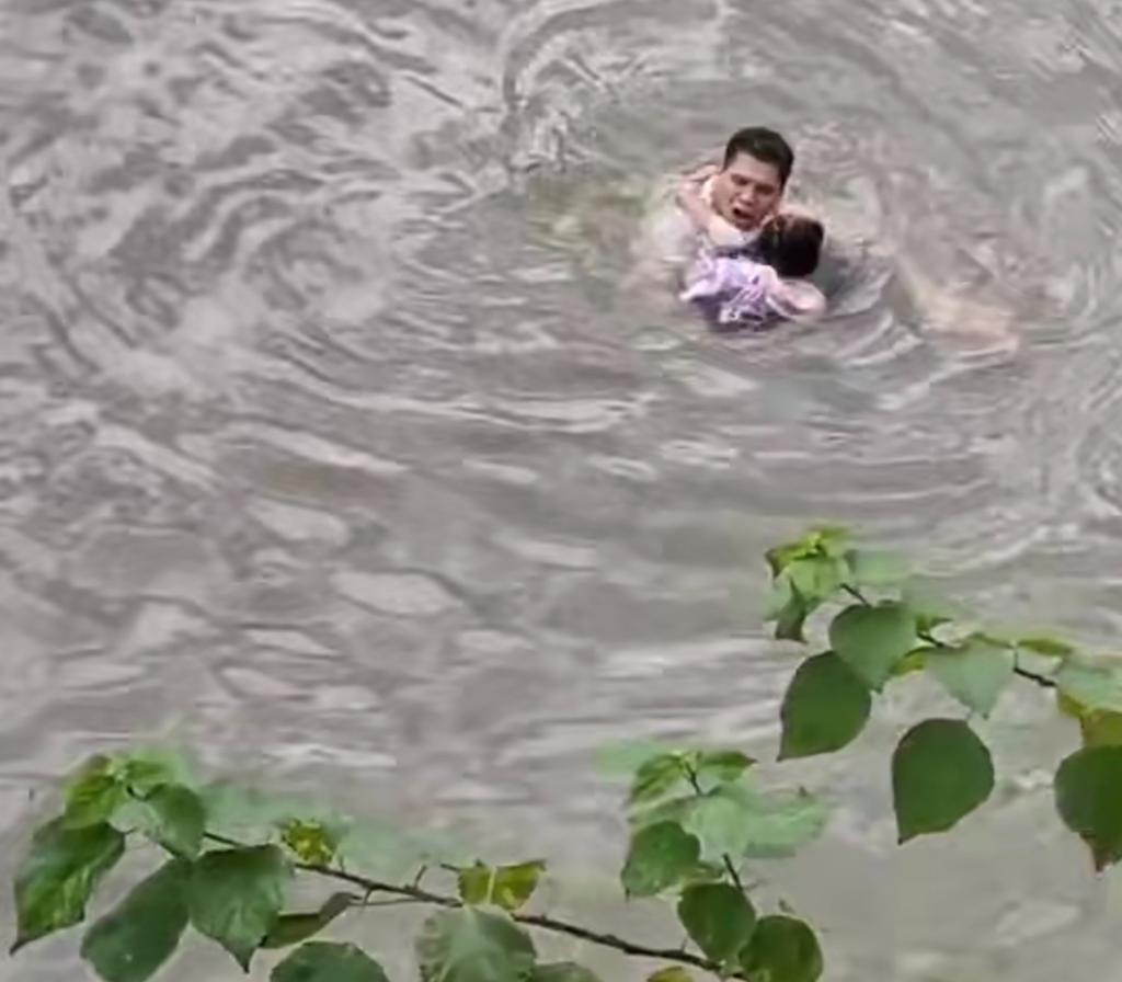 在附近吃早餐的罗金志听到呼救,连忙跑到河堤查看。没有多想,他放下手机,从约8米高的河堤纵身一跃,奋力向女童游去。