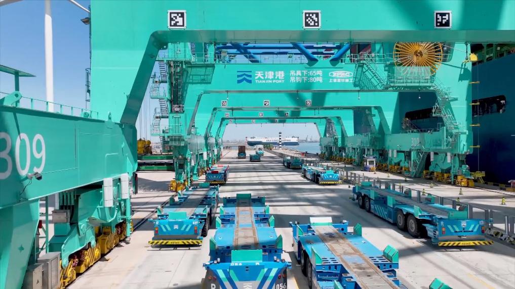 走进全球首个“智慧零碳”码头——天津港北疆港区C段智能化集装箱码头,全流程无人自动化作业场区内,人工智能运输机器人往来穿梭。