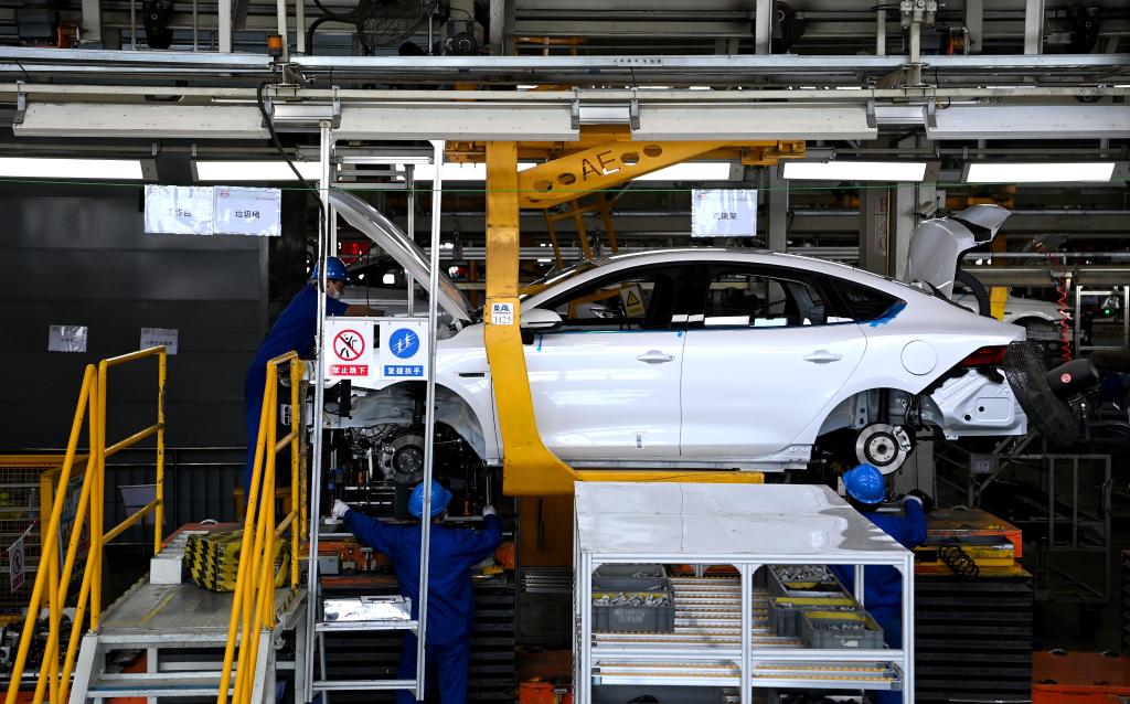 2022年4月20日,工作人员在西安比亚迪草堂工业园汽车总装厂进行新能源汽车装配。新华社记者 刘潇 摄