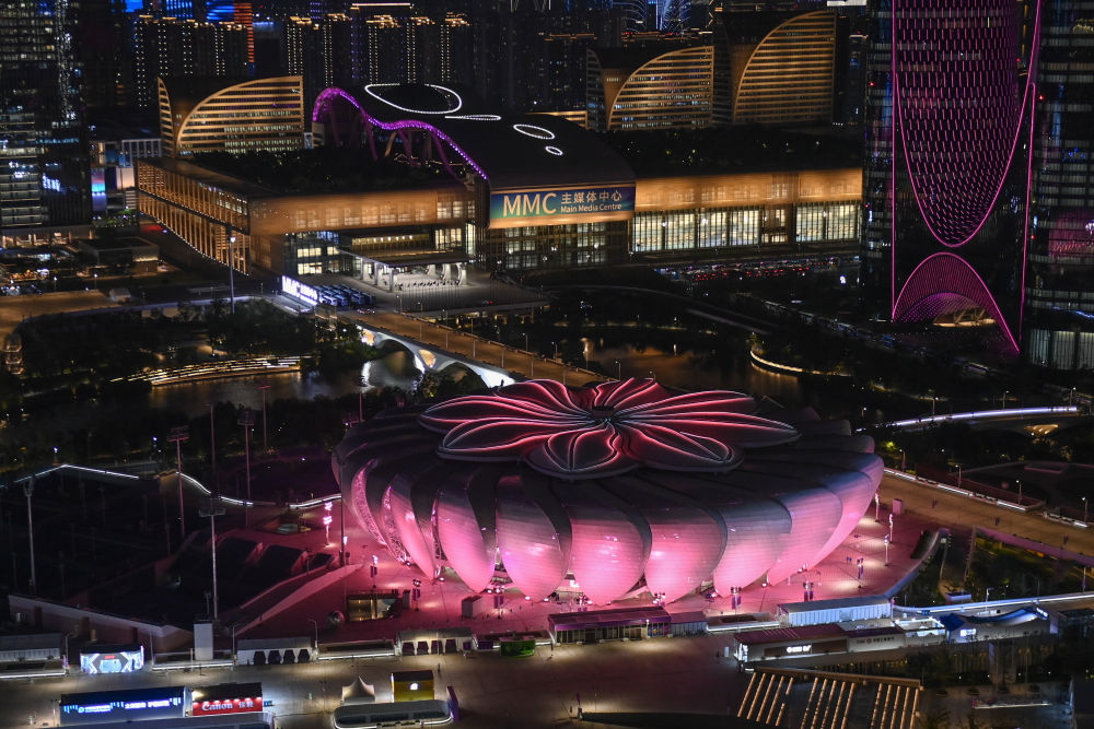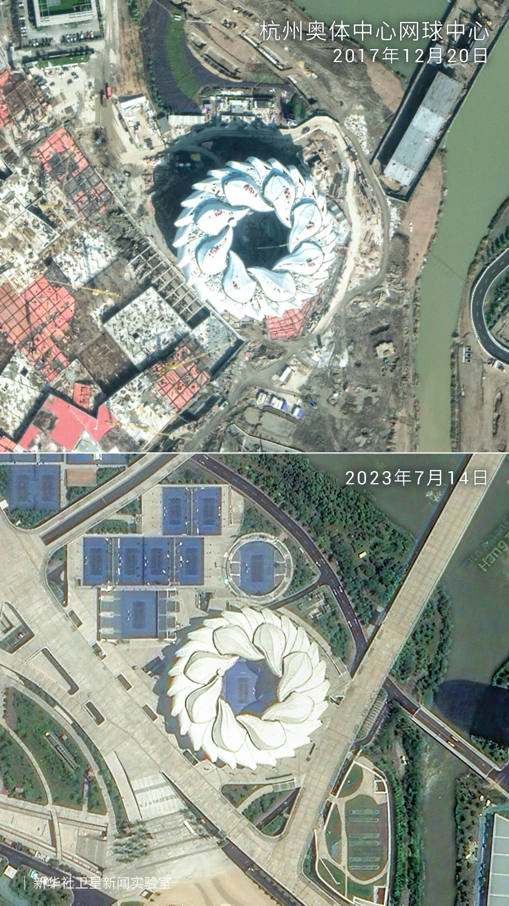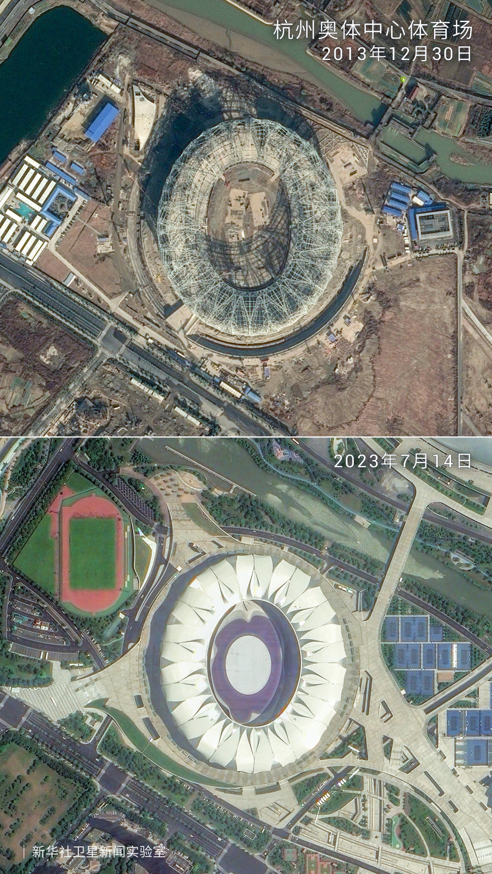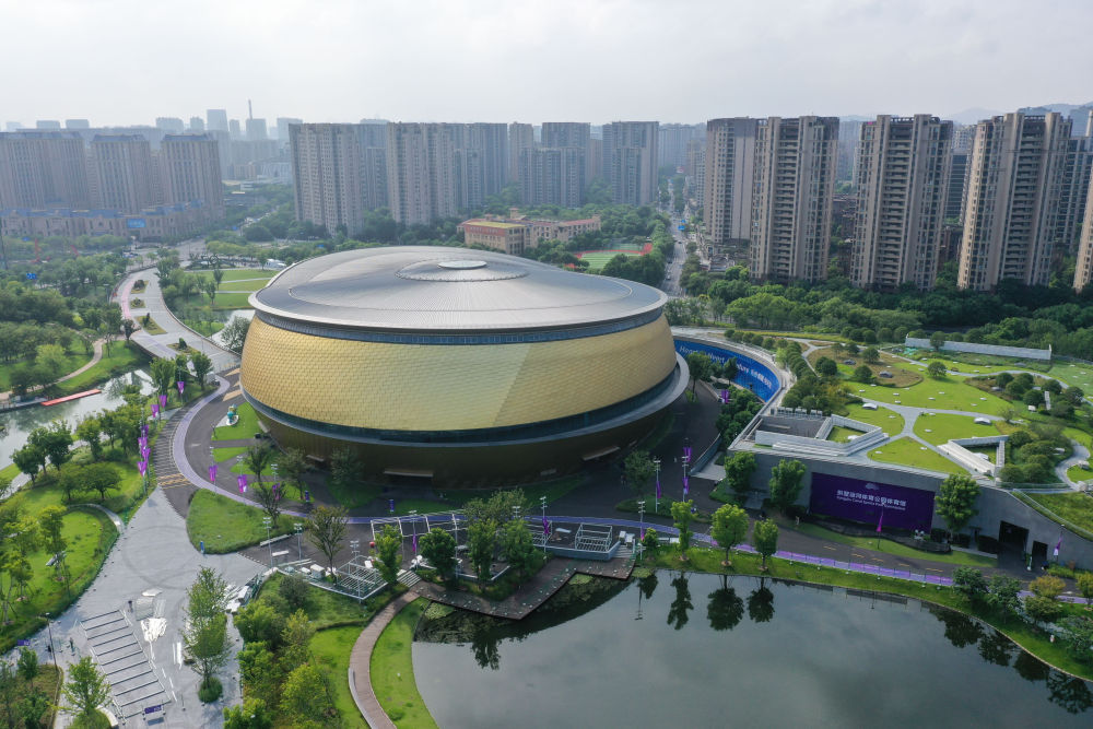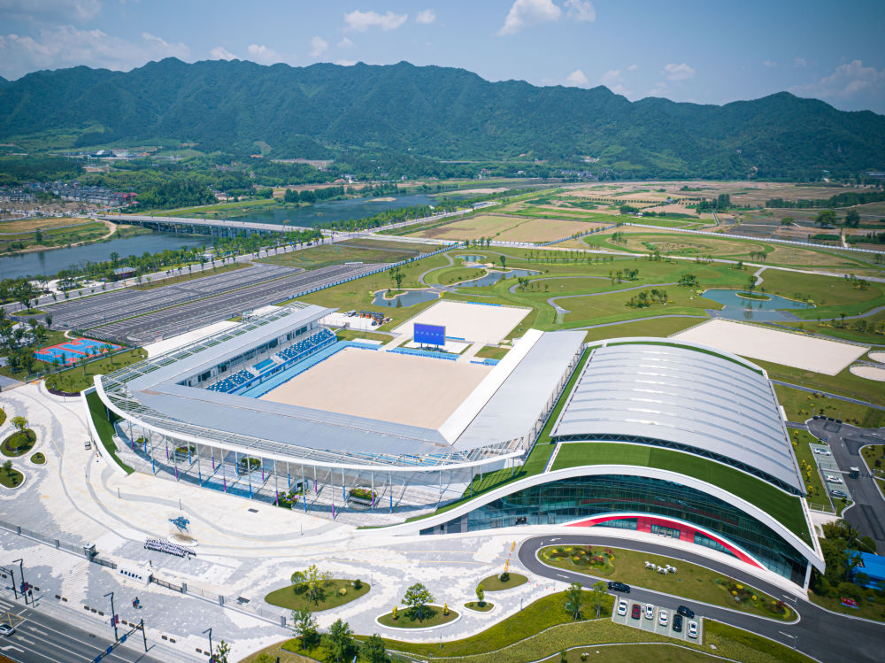 ↑这是2023年8月23日拍摄的拱墅运河体育公园体育馆(无人机照片)。新华社记者 黄宗治 摄