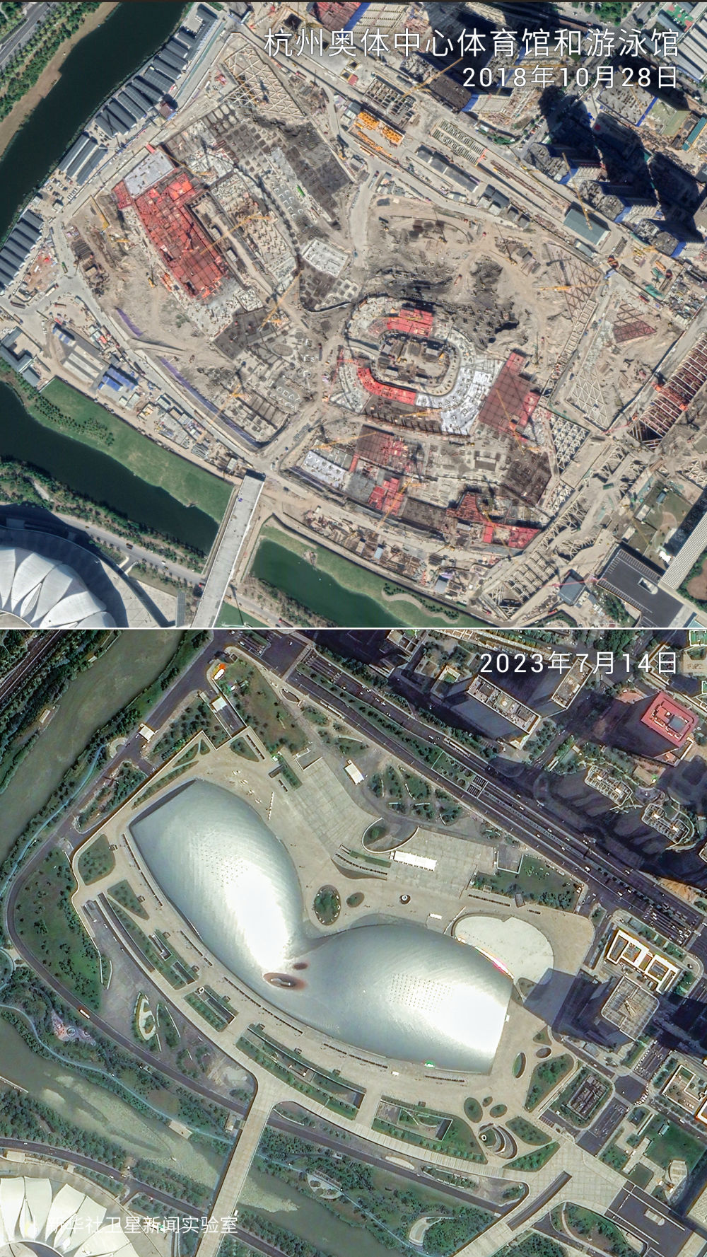 ↑这是2023年4月26日拍摄的杭州奥体中心体育场(右)与杭州奥体中心体育游泳馆(无人机照片)。新华社记者 江汉 摄