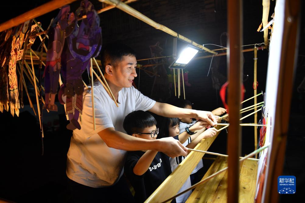 9月15日,在郴州长卷文旅城,非遗传承人带领小朋友体验皮影技艺。新华社记者 陈振海 摄