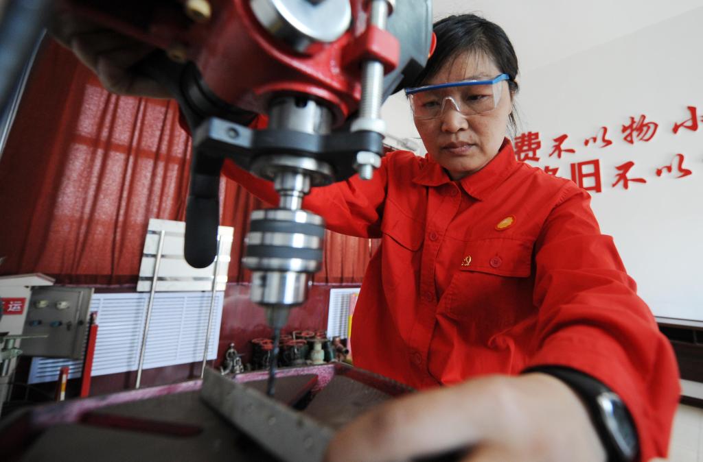 采油女工刘丽在工作室内加工设备。新华社记者王建威 摄