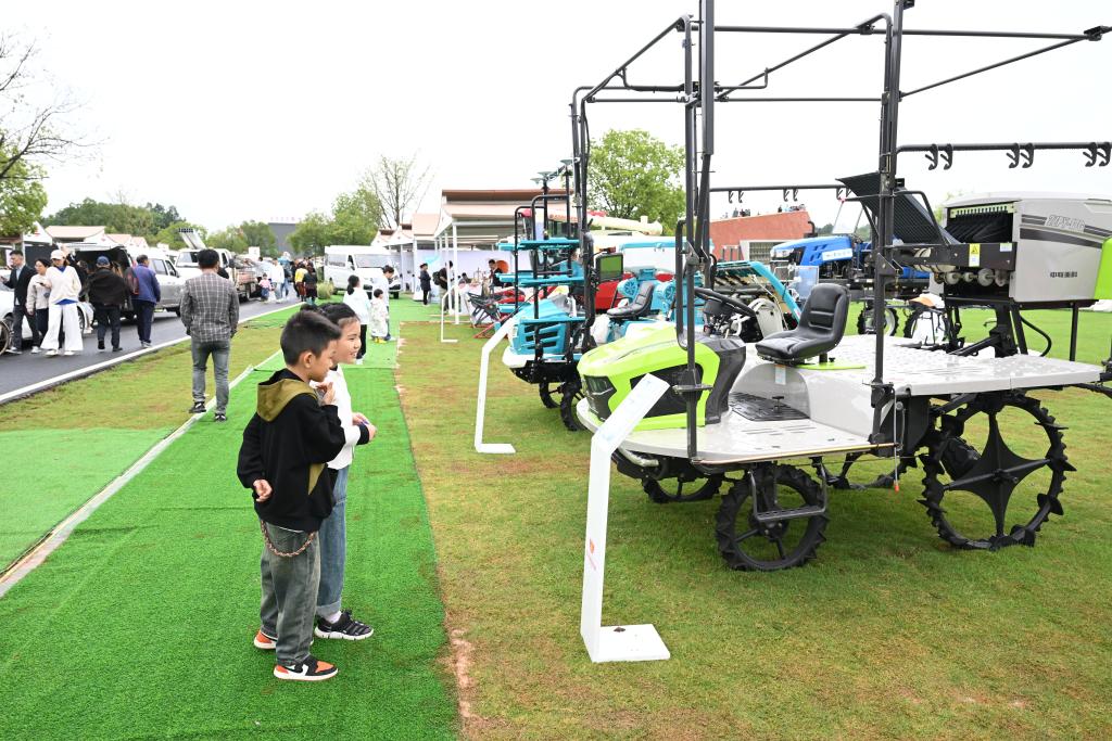 在第六个中国农民丰收节全国主场活动举办地安徽芜湖,集中展示的农机装备吸引了小朋友们观看。新华社记者 黄博涵摄