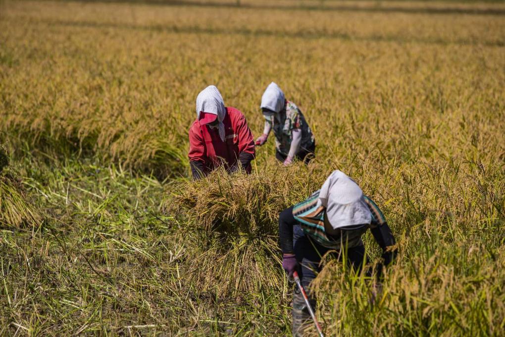 辽宁省盘锦市大洼区高坎村,农民在收割水稻。(受访者供图)