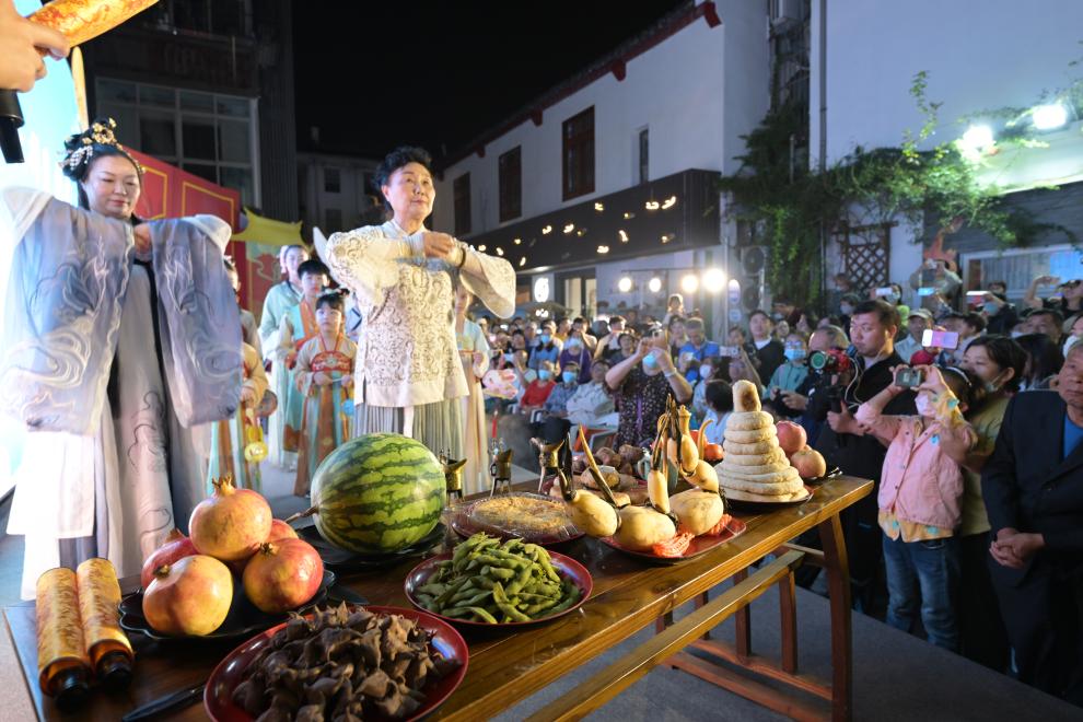赏月、拜月,祈求团圆美满,是中秋由来已久的风俗。江苏省扬州市举办的第二届仁丰里中秋民俗文化节中,最受瞩目的要数中秋拜月仪式。参与者们通过上香、祭酒等传统仪式环节,寄托风调雨顺、月圆人圆的美好愿望。