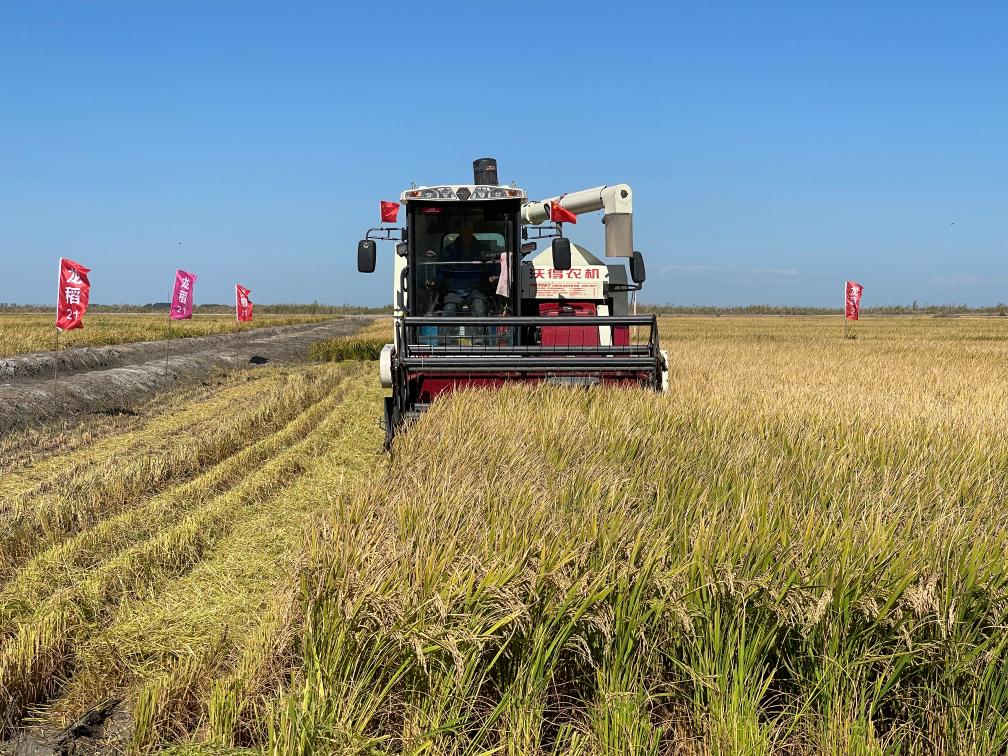 黑龙江省安达市先源乡八里岗村盐碱地水稻正在收获。新华社记者黄腾 摄