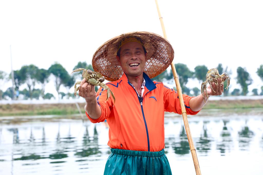 湖南省益阳市大通湖区的蟹农正在展示刚捕捞上来的大闸蟹。(钟浩 摄)