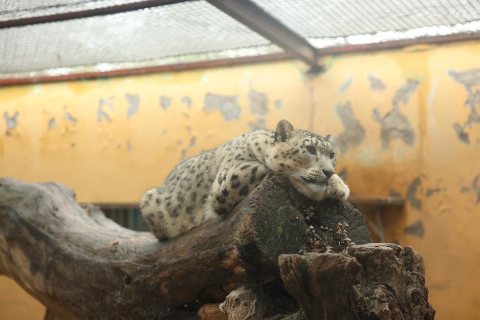 金秋时节,走进青海省西宁野生动物园豹馆,雪豹“凌霜”“大虎”正相互依偎;雪豹“凌夏”时而趴在横木上休息,时而活跃地行走奔跑;雪豹“凌不服”冒着头四处张望,警惕地观察室外情况。