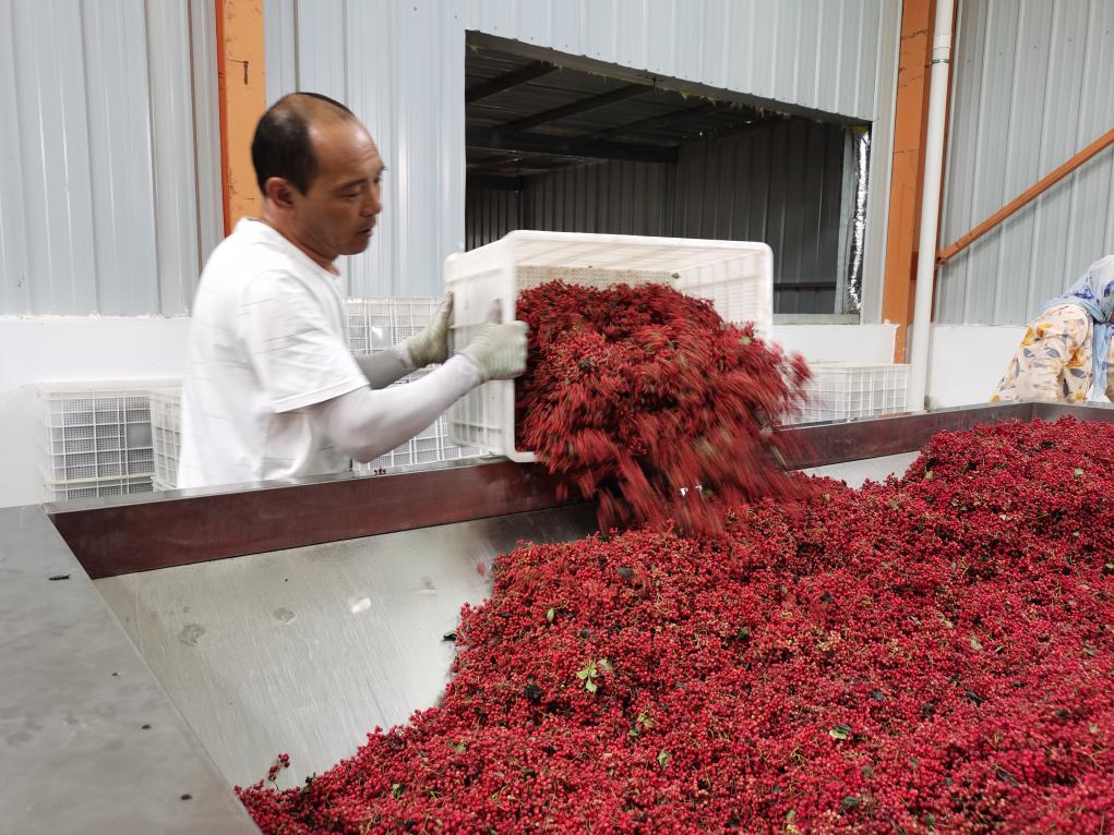 一位村民正在新义村的花椒加工厂里加工花椒。(受访者供图)