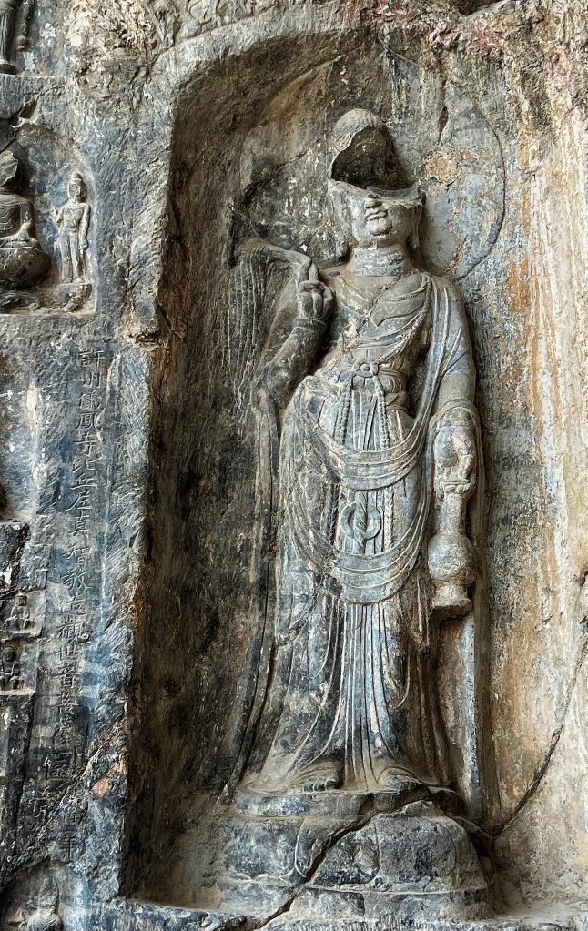 龙门石窟万佛洞前庭南壁一圆拱龛内的观世音菩萨立像。新华社记者 唐健辉 摄