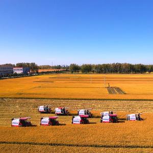 眼下,在黑龙江省绥化市北林区的水稻科技示范田里,金灿灿的水稻长势喜人,秋风拂过,稻浪翻滚,稻穗随风摇摆,空气中弥漫着稻香,一台台收获机车往来穿梭,田间路上一辆辆运粮车满载而出。
